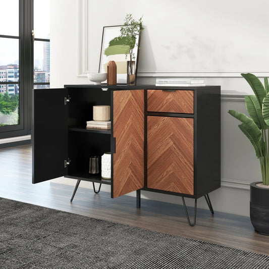 Moderne Houten Dressoir – 90 x 72 x 30 cm – Zwart & Houtlook Kast met Opberglades